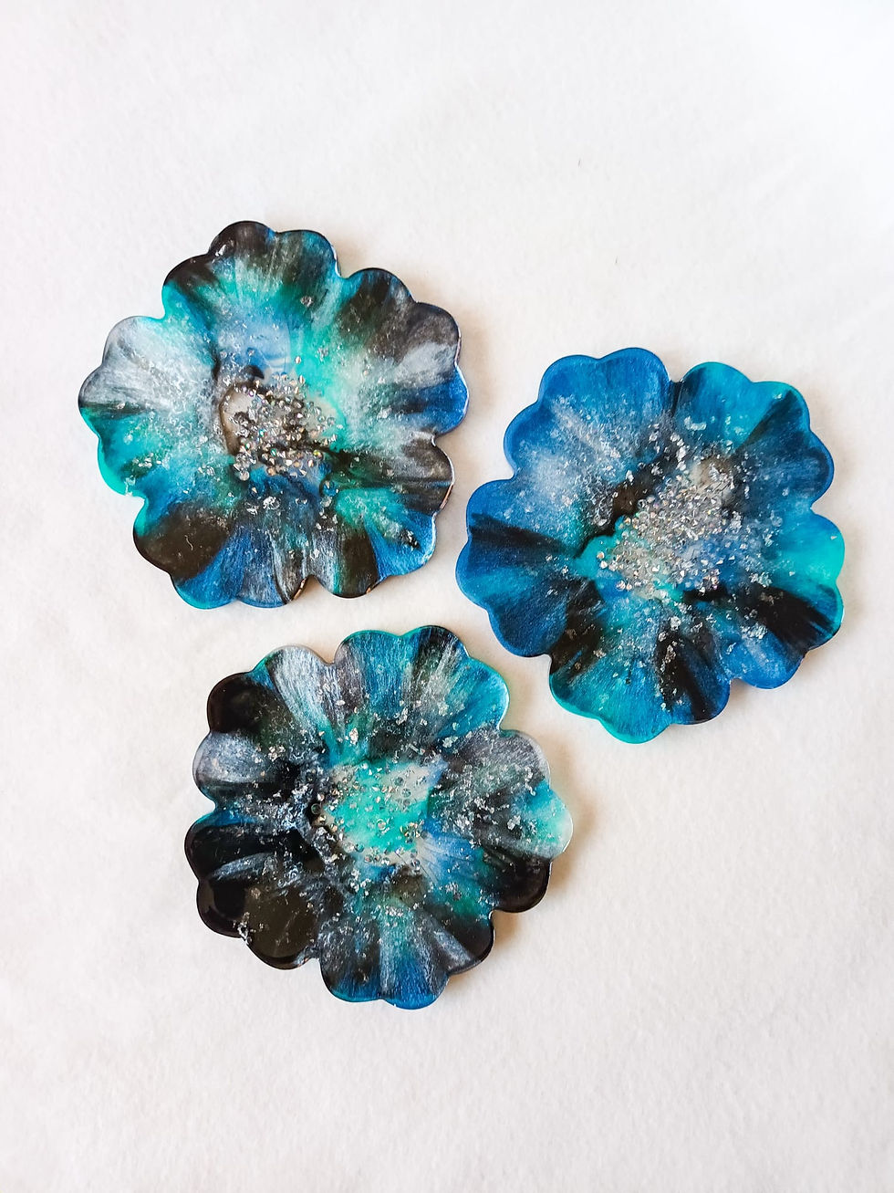 These unique coasters can be purchased in sets of two, three and four. Larger sets can be commissioned. Each set of designs will abe individual - within the same colour band. No two sets will be the same as Fluid Art is a highly creative and individual discipline.